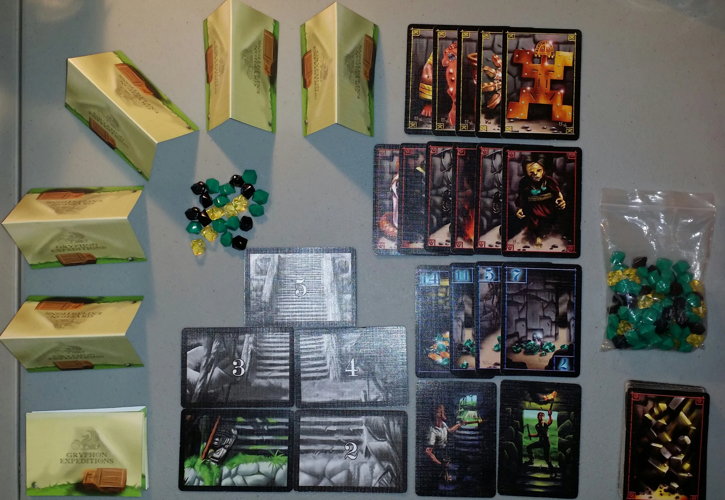 During setup, each player receives a tent and two cards (1 Torch card and 1 Camp card). Then the Temple is built, representing the ruins players are exploring. The treasure pool (gem tokens — Turquoise are 1 point/Obsidian are 5 Points/Gold are 10 points) are placed in a pile next to the Temple and the Artifact cards (5 total) are shuffled and placed face-down, randomly, under the Temple cards — one each. Once this is done the first round is ready to begin.