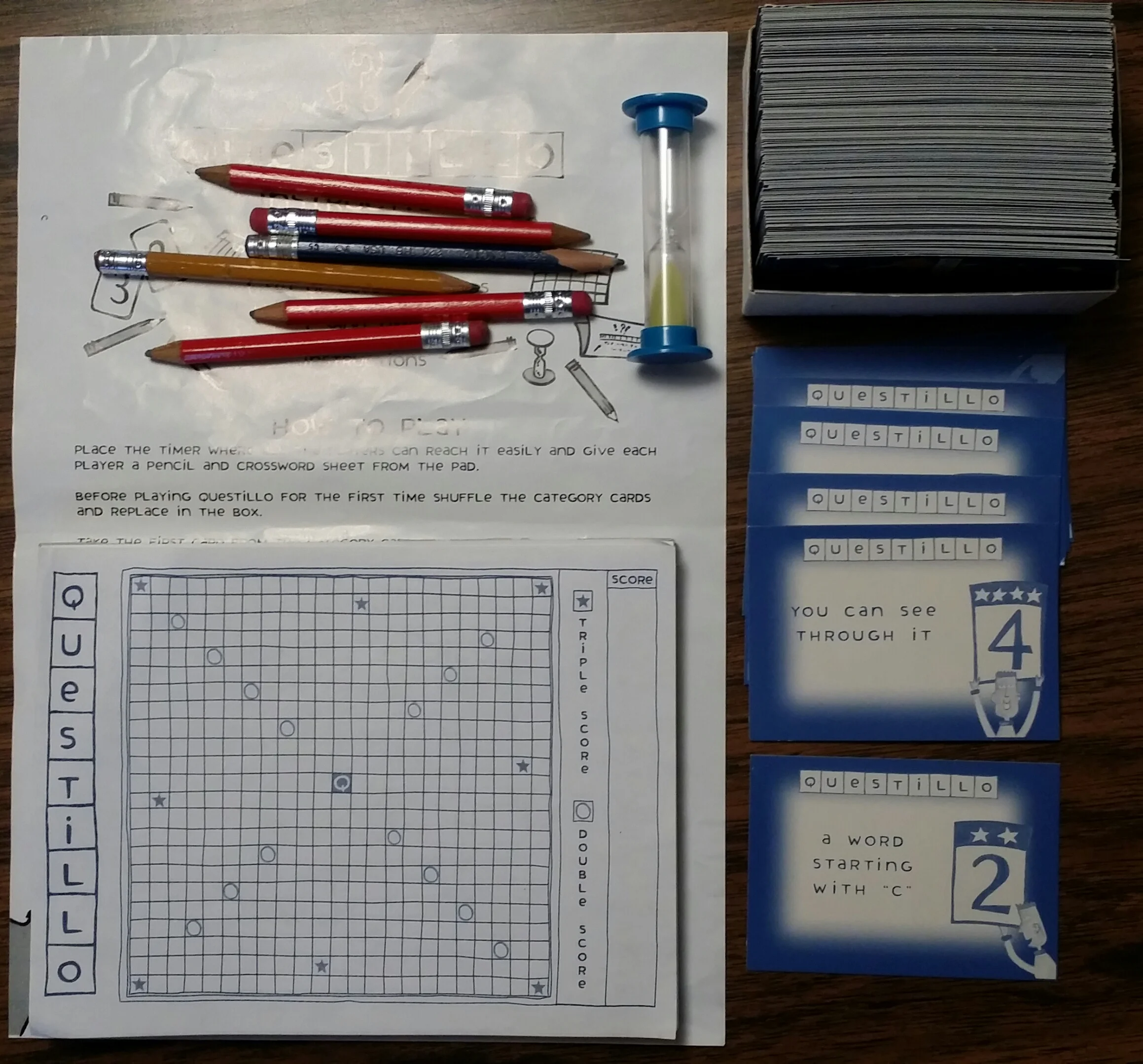 All players get a pencil and crossword pad. The Category cards are shuffled. And you are ready to begin!