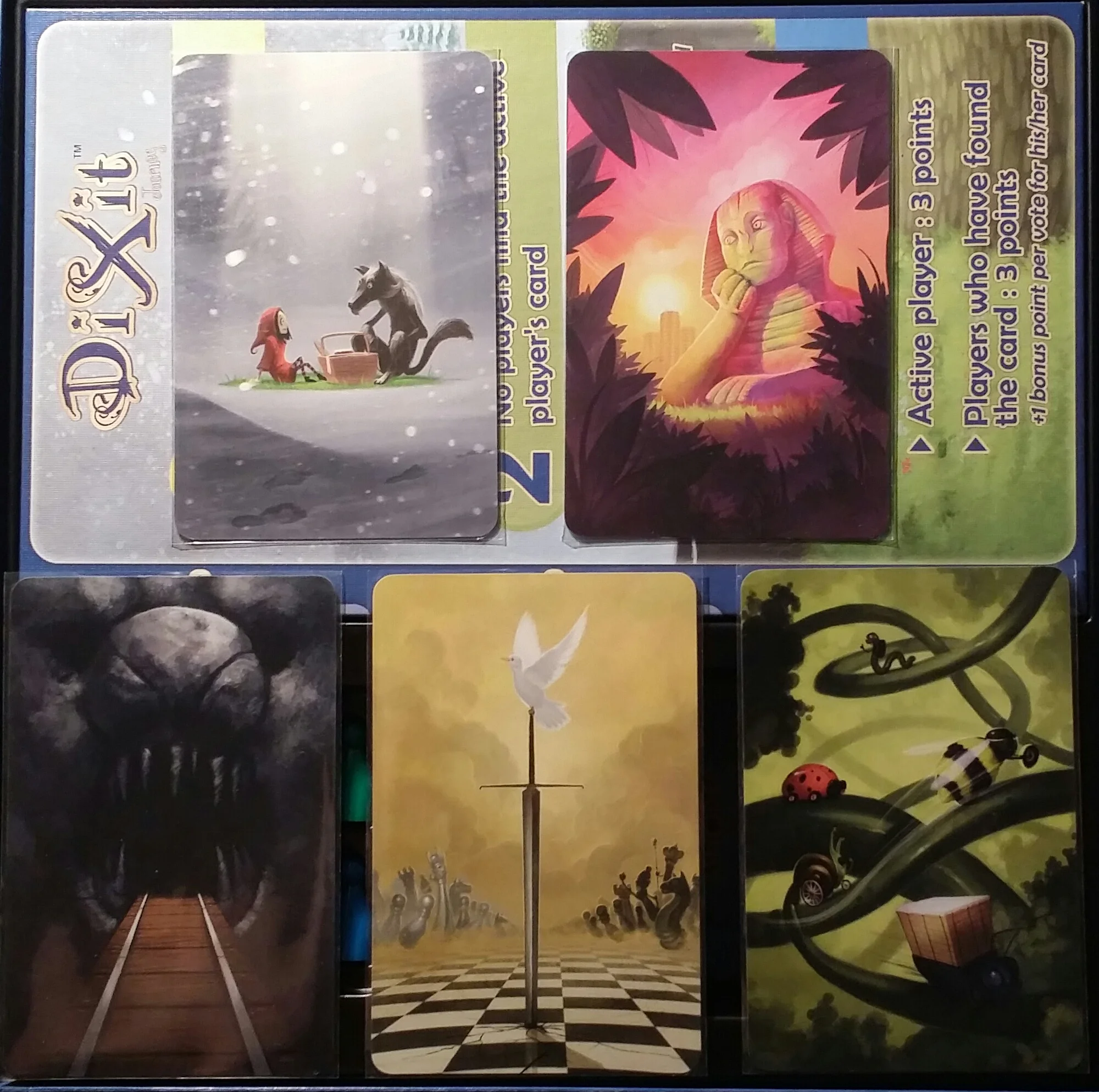 Each player is dealt six full art cards (yeah, I thought it was five when I took the picture...) that they keep to themselves. It's important that players don't see their opponent's cards. The starting player (anyone who wishes to announce themselves as being the first player) picks a card from their hand and gives the other players a clue. The clue can be a word, a phrase, a song you sing, an intricate story you weave, etc etc. You decide. The trick is that you want to have at least one person guess which card is yours during the voting phase, but not everyone. You also don't want everyone to fail either.